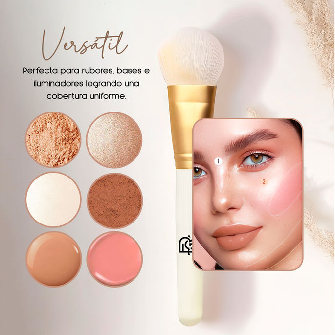 Nuestra brocha multifuncional está diseñada para ofrecer una aplicación precisa y suave en cada uso. Perfecta para rubores, bases e iluminadores, esta herramienta te ayudará a lograr una cobertura uniforme y un acabado profesional sin esfuerzo.